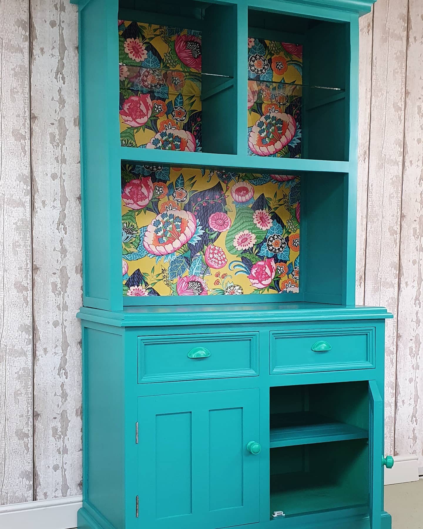 This amazing colour is aptly called 🎨Aquadazzle from Colourtrend Paints. I didnt have any hardware for it so I used some mismatched ones I had spare and revamped them in this beautiful contrasting green colour that I mixed up. I was saying that while in lockdown I was going to try colour combos that I normally wouldnt. While I had always planned on this main colour with the wallpaper, I wasnt so sure on a contrasting colour for inside so I starting mixing and came up with this green. I am now so in love with this blue green combo. The weird thing is i dont think I can use this main colour again on anything. Id feel like I was cheating on this piece 🙈. This happens a lot when I use wallpaper for decoupage too, once I’ve used it on a piece that’s it and I don’t use it again. I have a load of wallpaper left over as you can imagine 😂 but it’s all available to use in my workshops so no waste 👌