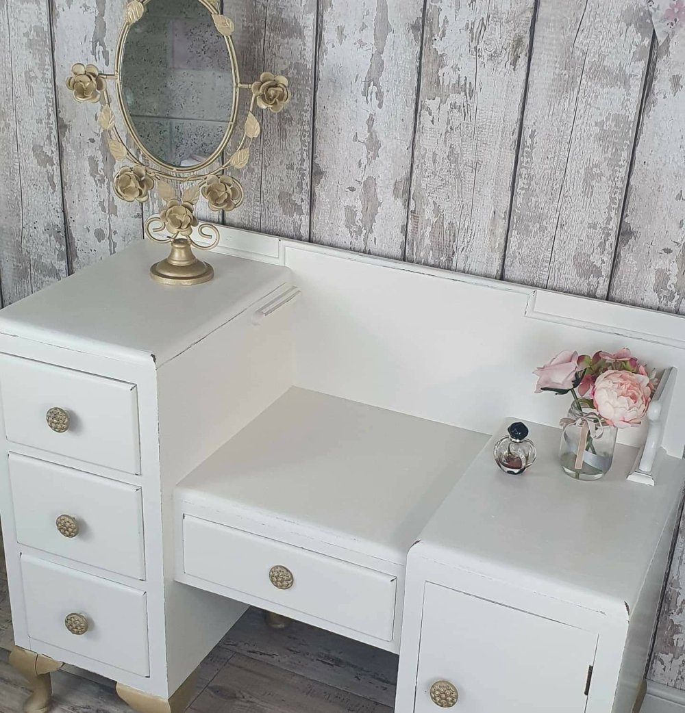 And another commission finished. This is a stunner of a dressing table, but definitely needed a little tlc and brightening up. Unfortunately the mirror had seen better days, although don’t ever be put off if you see a beautiful old dressing table where the mirror is unusable. There are ways around everything and a standalone mirror can work just as well. Evertime I see feet like this I just have a compulsion to make them gold.