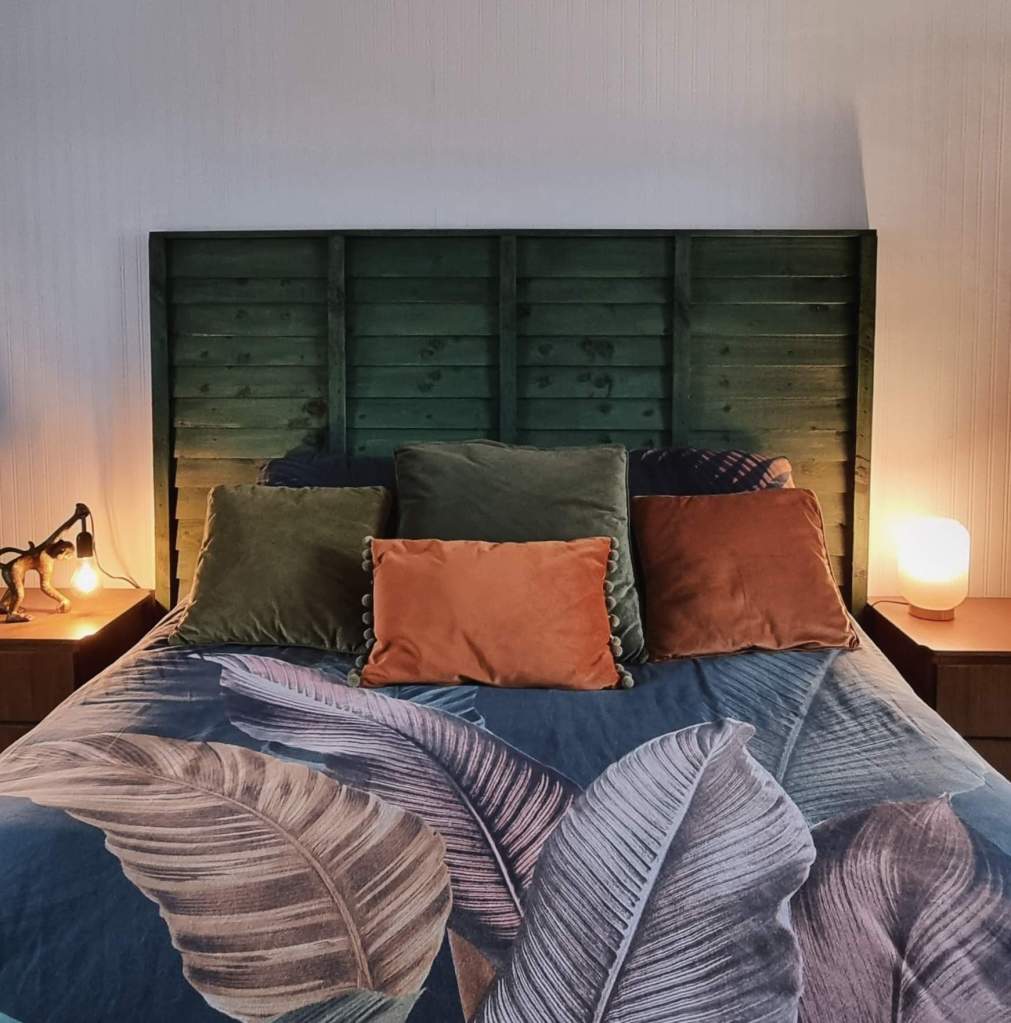 So I did up our bedroom recently and I wanted a new headboard for the bed. I really wanted something rustic so decided I’d make a pallet headboard, which of course went on the loooong finger ๐. In the meantime we were getting a new garden fence in, and ordered an extra panel by accident. Said we would keep it, as shur it might come in handy sometime ๐. Then a light bulb went off in the head and by the end of the day we had a new headboard ๐คฃ๐คฃ. I watered down the paint just to give it a wash of colour and stuck it up on the wall and I’m delighted with it. Now I have a load of pallets left ๐ค ๐คฃ
